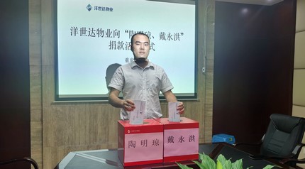 截止7月23日,洋世達集團公司員工及長壽陽光世紀城業委會代表累計自愿捐款52832元。其中,陶明瓊28116元,戴永洪24716元。7月28日、30日集團黨委、工會代表將這兩筆捐款送到了兩名員工手中,希望他們能夠頑強戰勝病魔,早日康復。